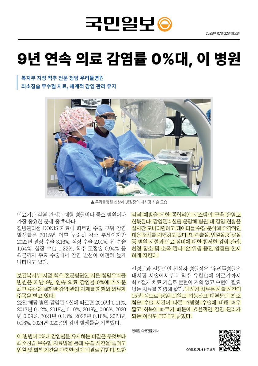 지난 9년 연속 의료 감염률 0%에 가까운 최고 수준의 철저한 감염 관리 체계를 지켜와 의료계 주목을 받고 있다.
