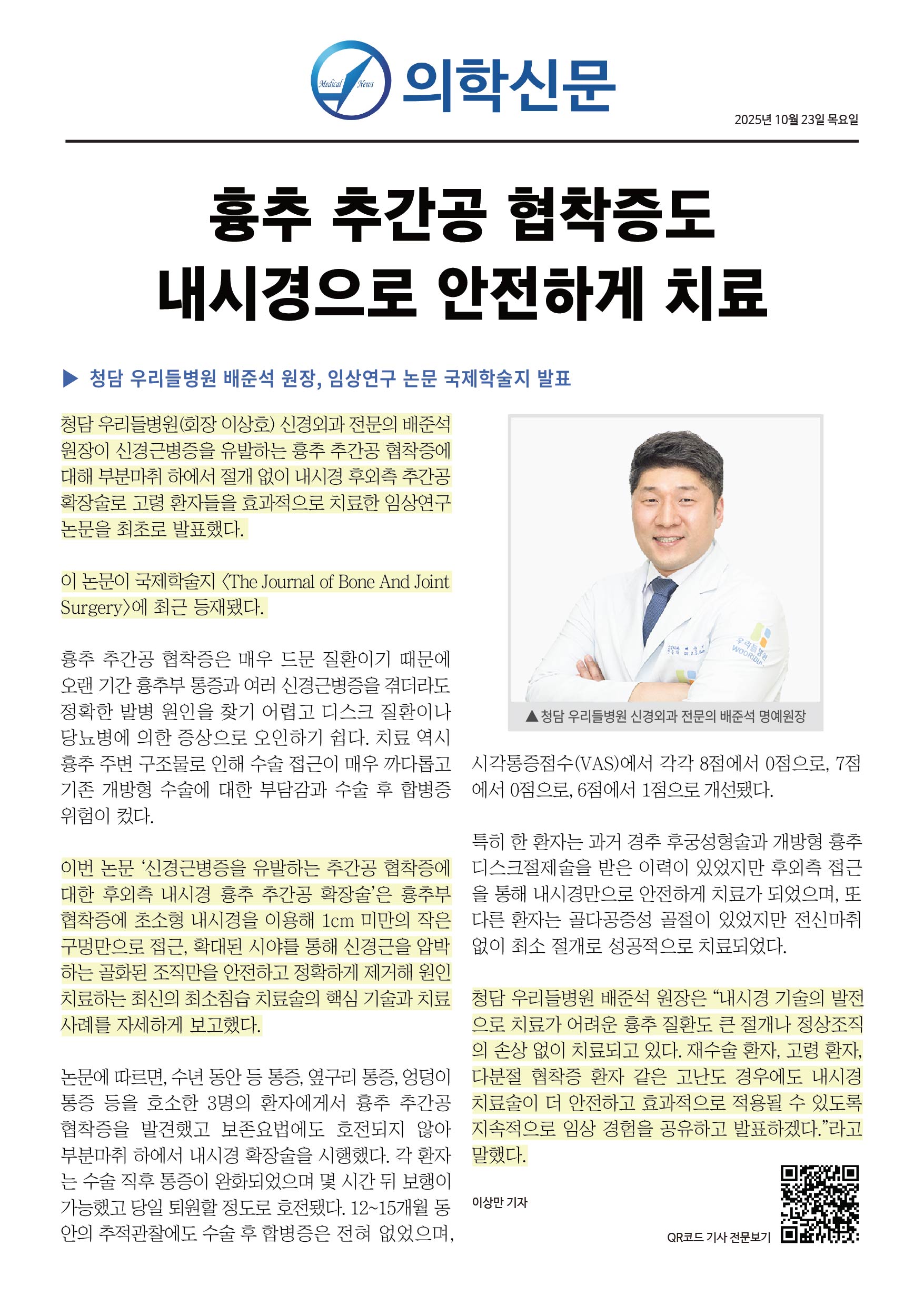 청담 우리들병원 배준석 원장, 임상연구 논문 국제학술지 발표