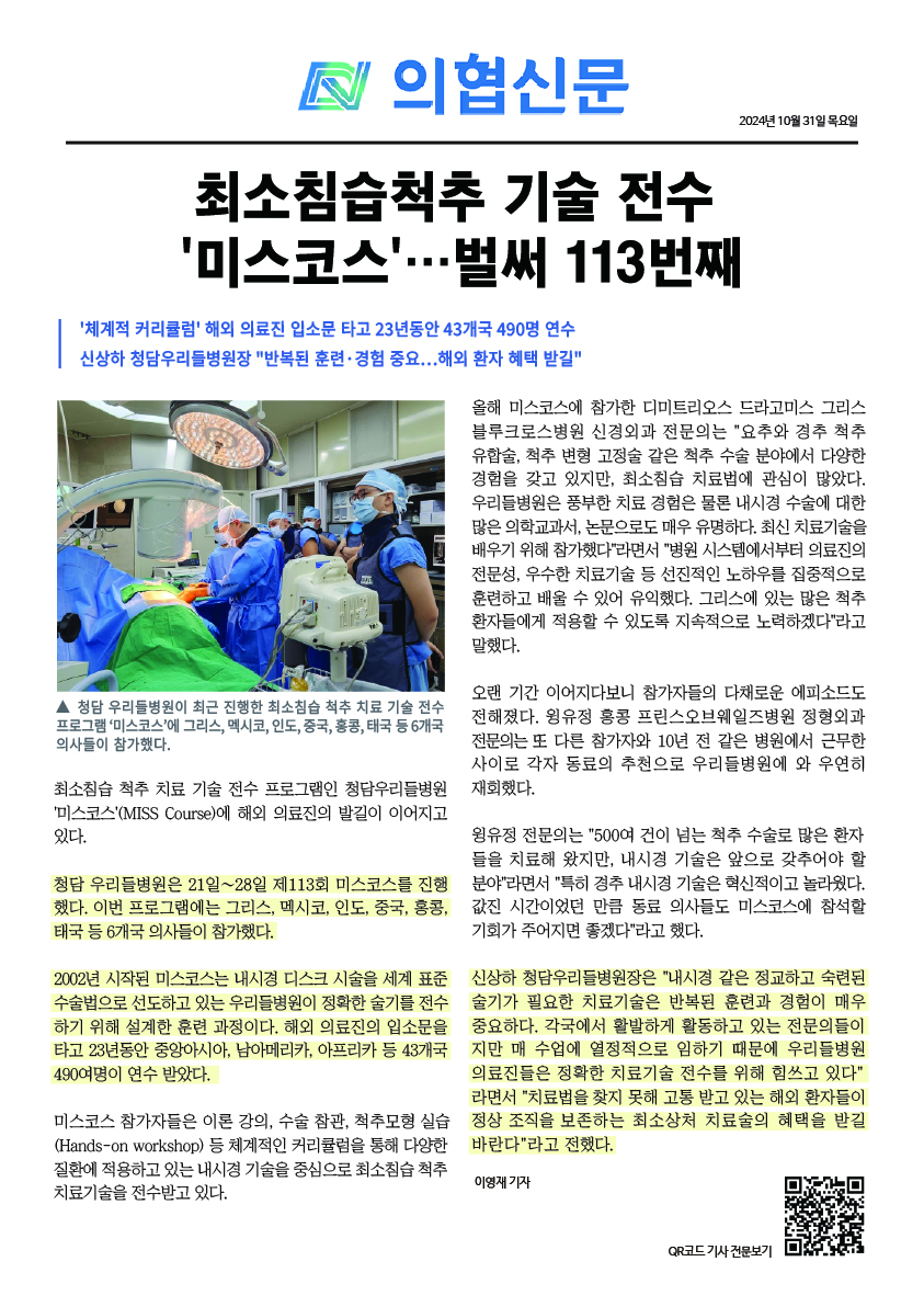 [113회 국제 최소침습척추수술 코스 참가자] – 국소마취로 수술을 한다는 점이 인상적이었습니다