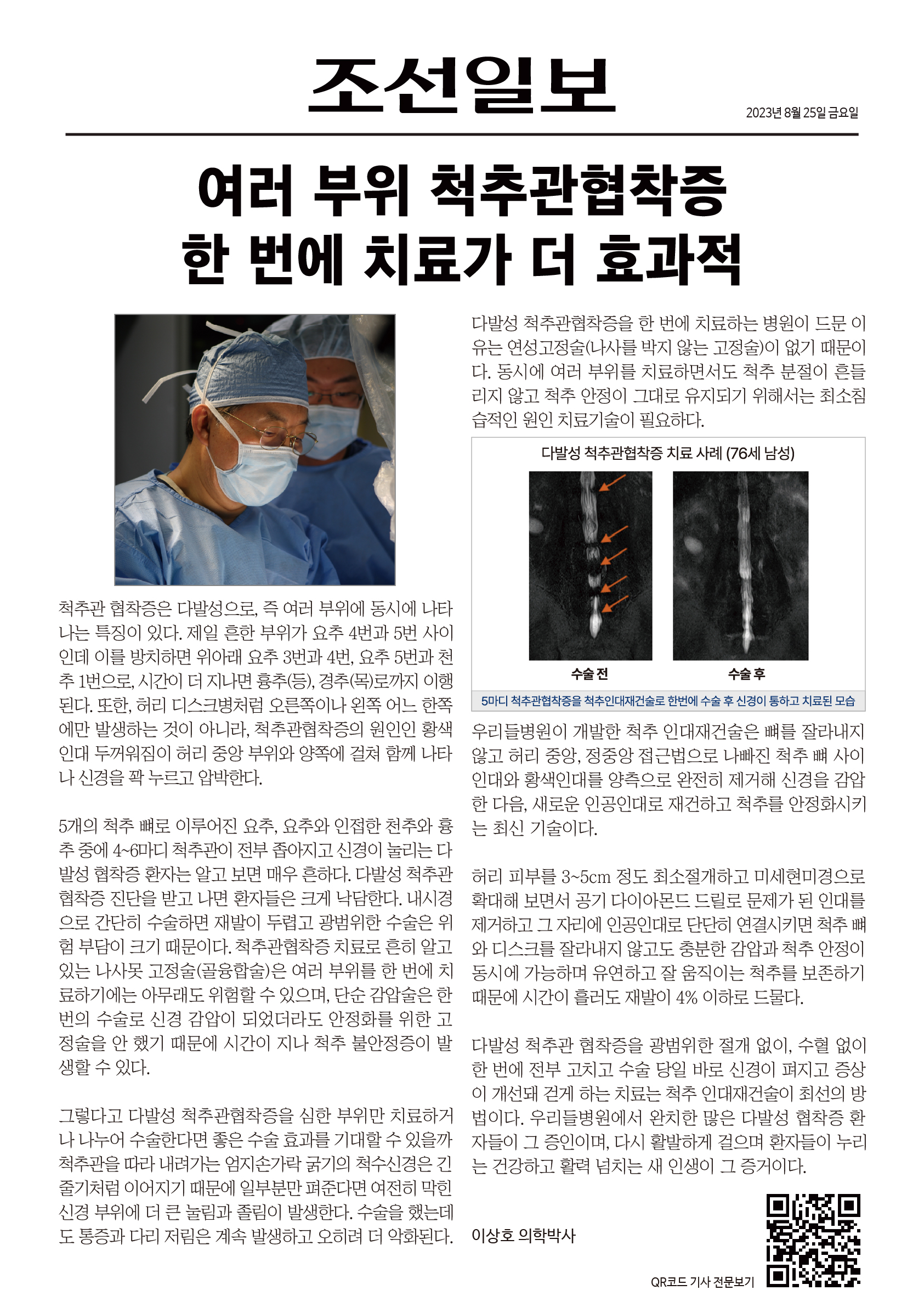 척추관 협착증은 다발성으로, 즉 여러 부위에 동시에 나타나는 특징이 있다.