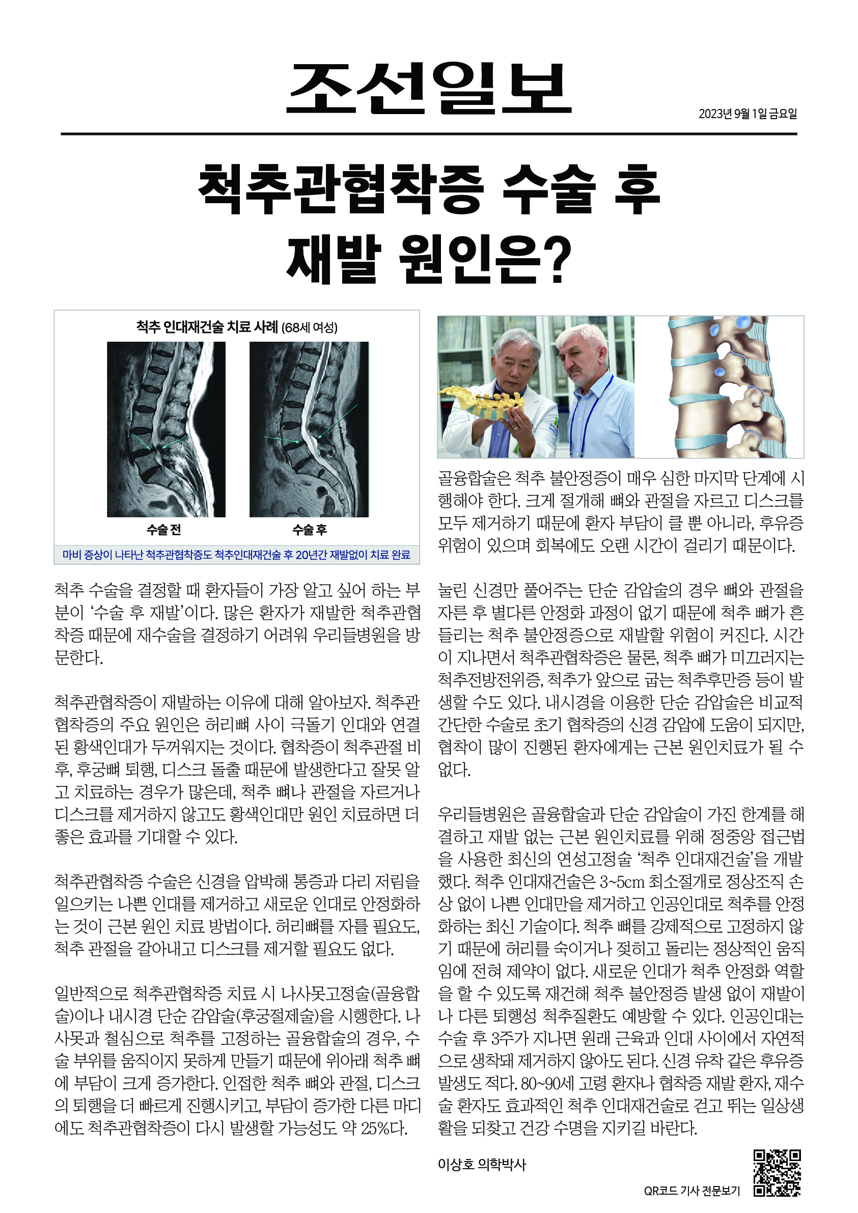 척추 수술을 결정할 때 환자들이 가장 알고 싶어 하는 부분이 ‘수술 후 재발’이다.