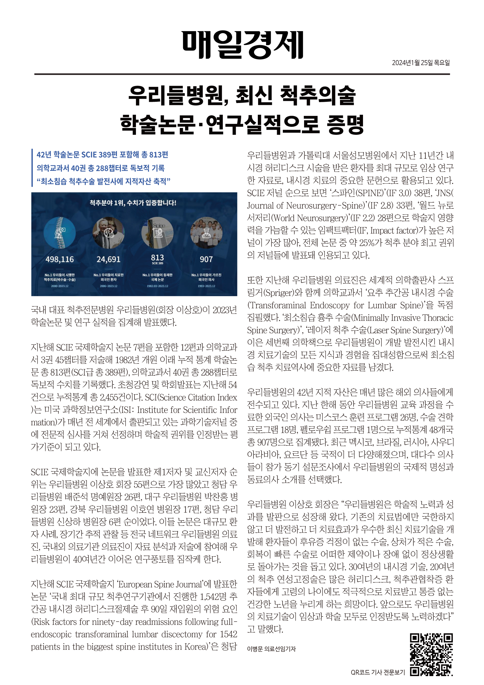 국내 대표 척추전문병원 우리들병원(회장 이상호)이 2023년 학술논문 및 연구 실적을 집계한 결과