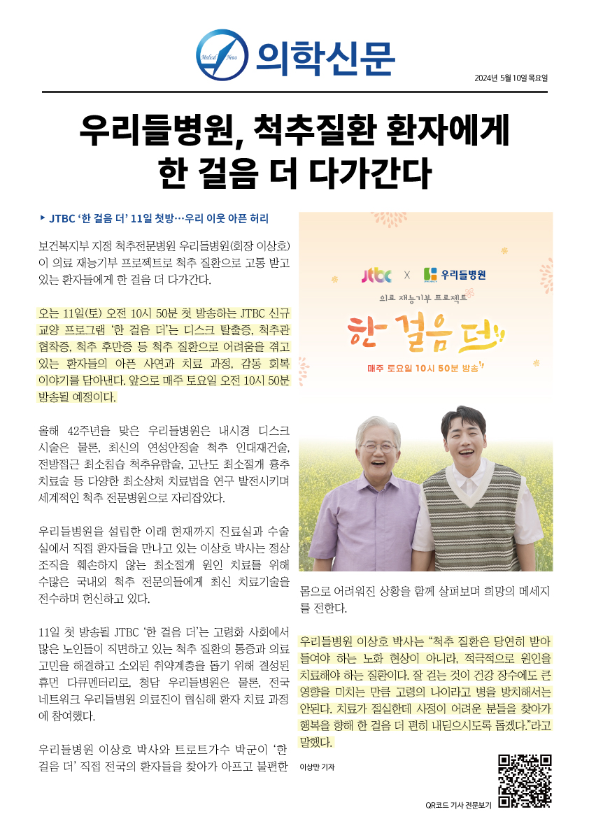 우리들병원 이상호 박사는 “척추 질환은 당연히 받아들여야 하는 노화 현상이 아니라,