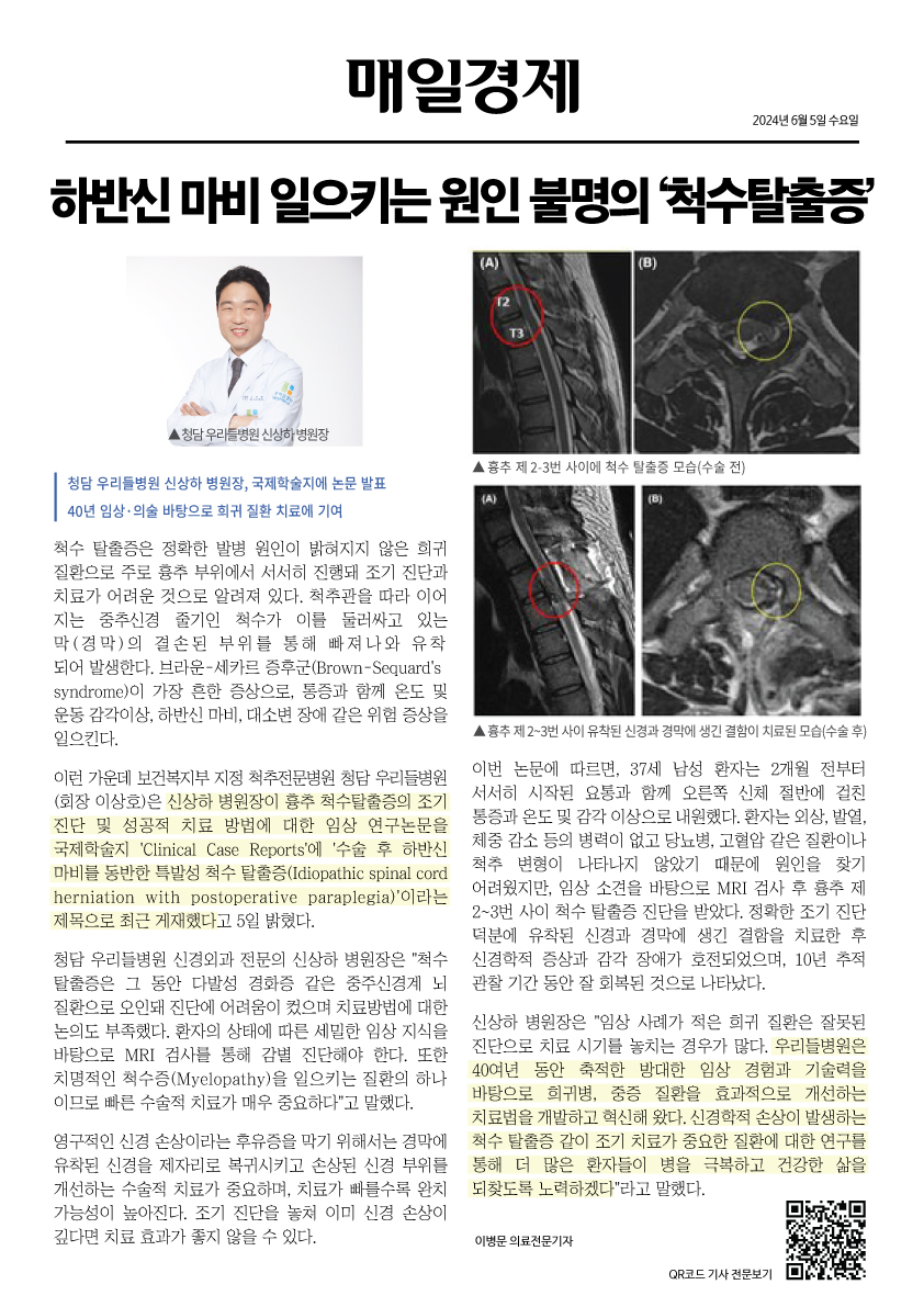 신상하 병원장이 흉추 척수탈출증의 조기 진단 및 성공적 치료 방법에 대한