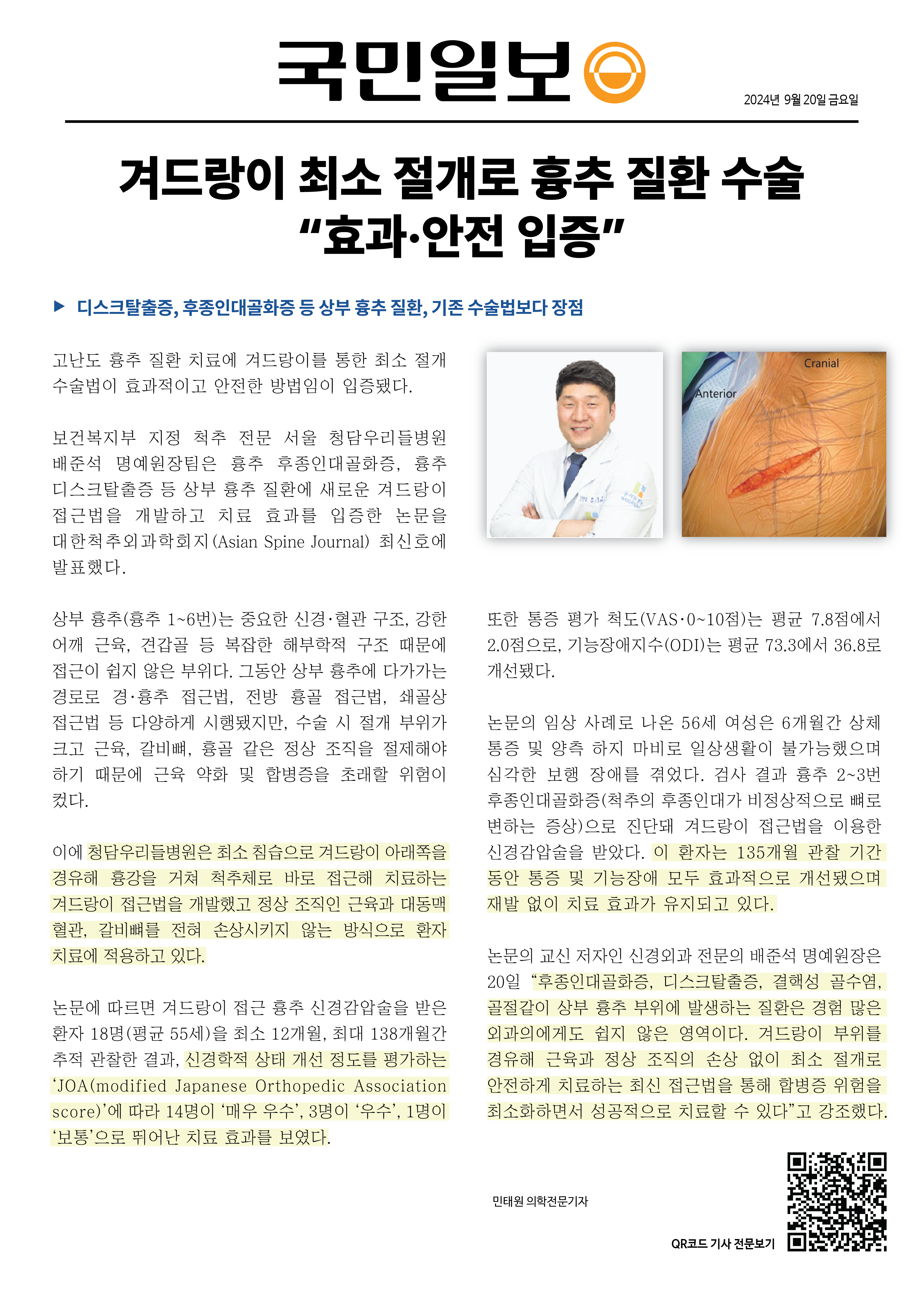 치료 효과를 입증한 논문을 대한척추외과학회지(Asian Spine Journal) 최신호에 발표했다.