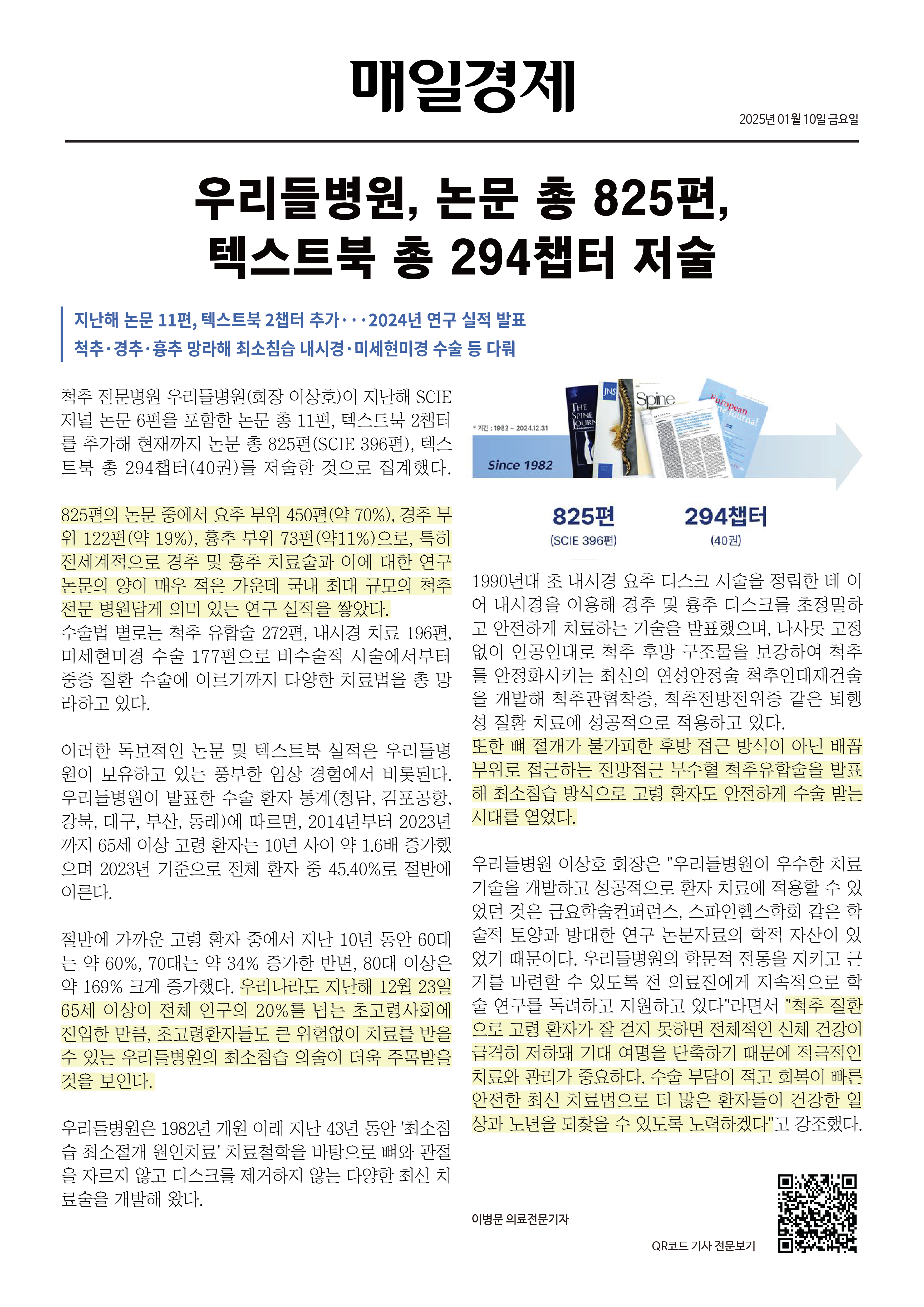 척추 전문병원 우리들병원(회장 이상호)이 지난해 SCIE 저널 논문 6편을 포함한 논문 총 11편, 텍스트북 2챕터를 추가해