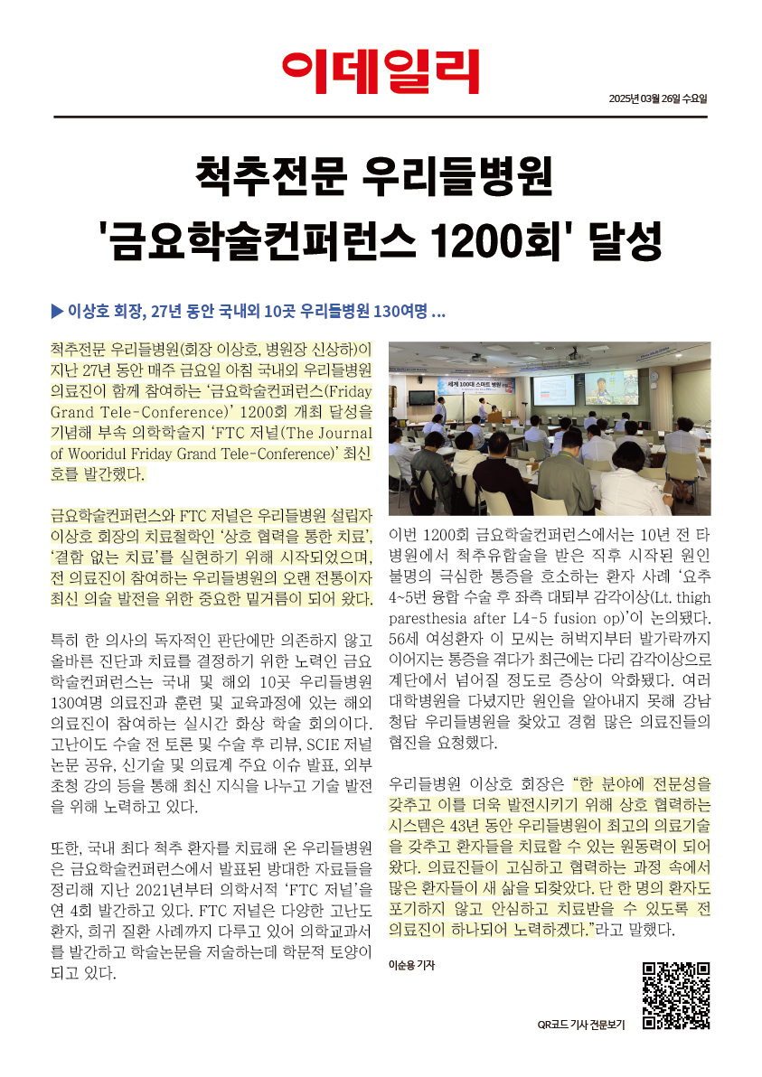 부속 의학학술지 ‘FTC 저널(The Journal of Wooridul Friday Grand Tele-Conference)’ 최신호를 발간했다.