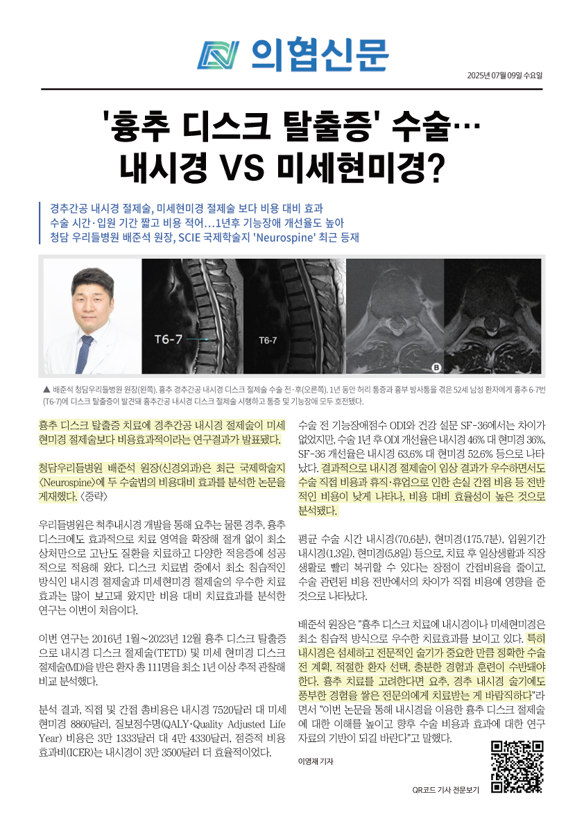 청담우리들병원 배준석 원장(신경외과)은 최근 국제학술지 에 두 수술법의 비용대비 효과를 분석한 논문을 게재했다.