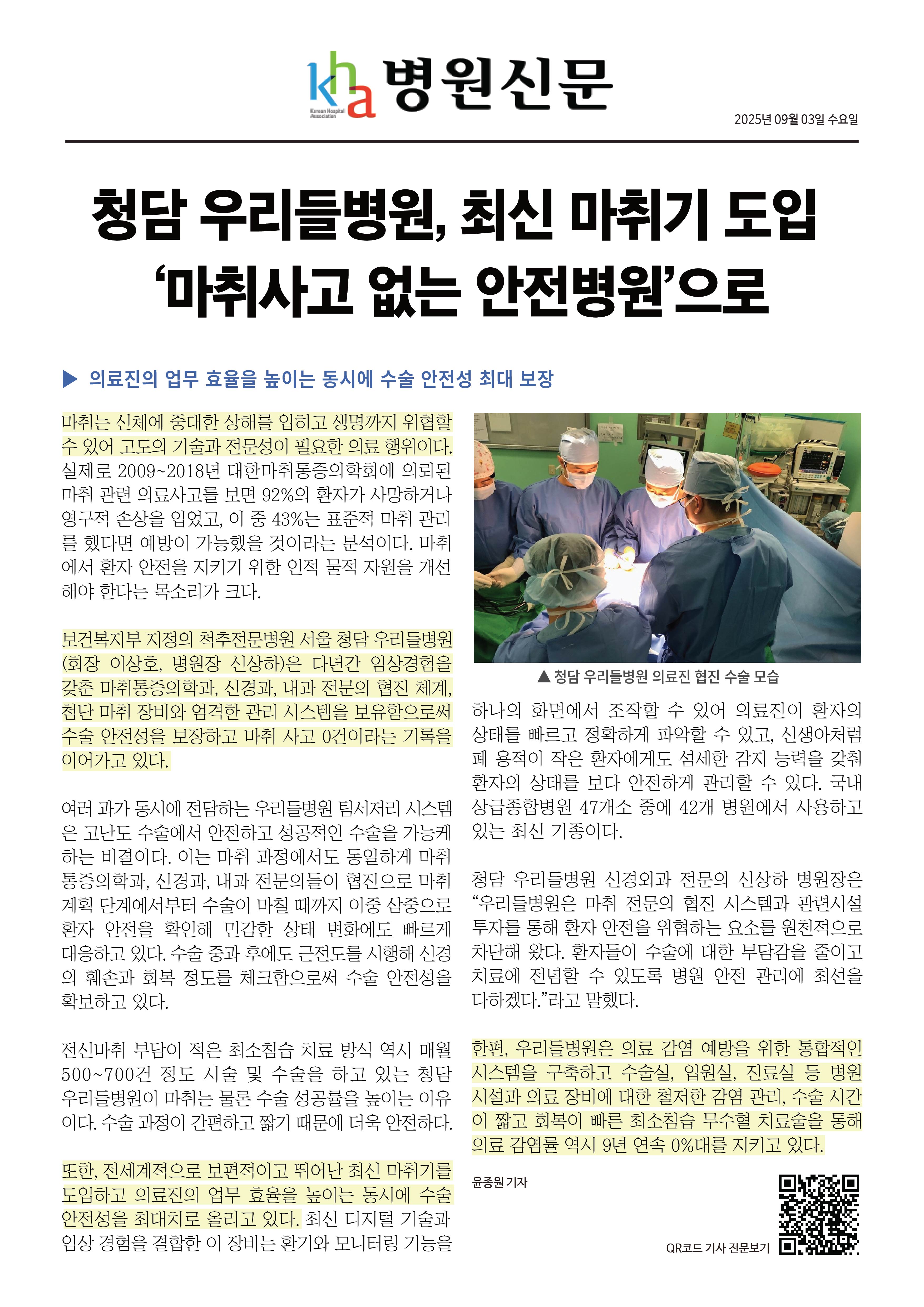 수술 안전성을 보장하고 마취 사고 0건이라는 기록을 이어가고 있다.