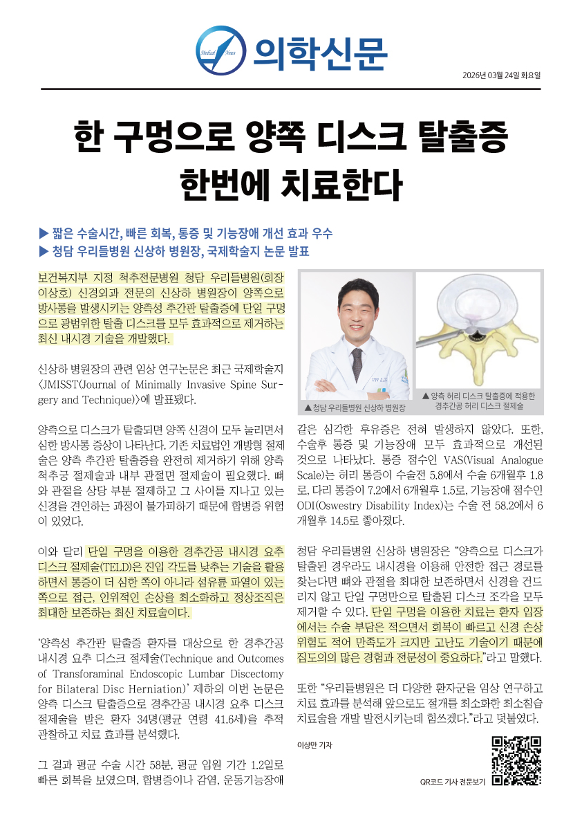기존 치료법인 개방형 절제술은 양측 추간판 탈출증을 완전히 제거하기 위해
